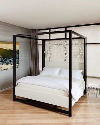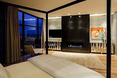 Камин в спальне является примером вдумчивого использования декоративных материалов.