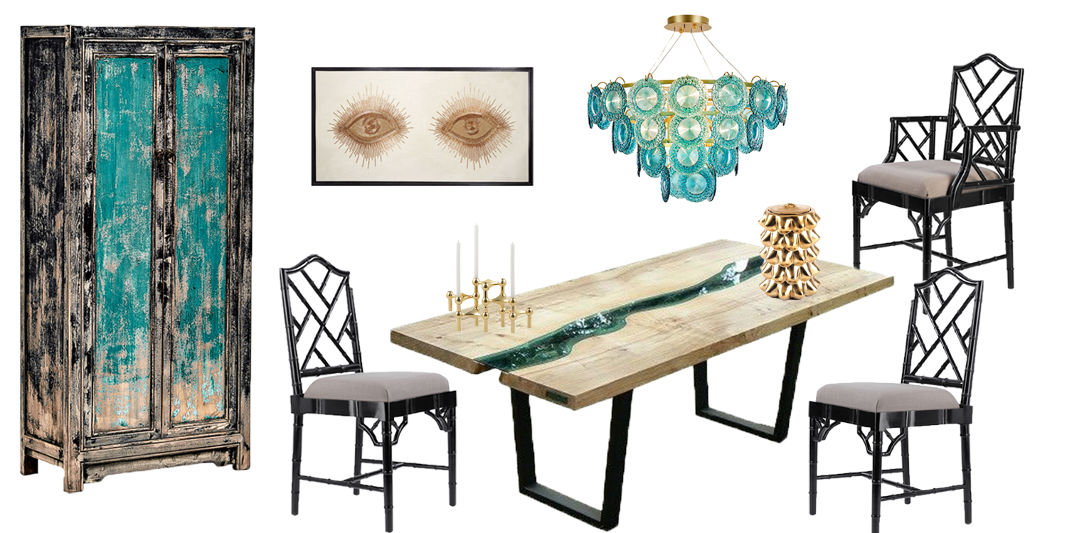 Наша новая подборка точно придется по вкусу ценителям эклектики. Данный вариант интерьера столовой ярко заявляет о себе и точно не оставит ваших гостей безразличными. Эффектный обеденный стол из коллекции River Collection выполнен из натуральных пород дерева, а вырезанный вручную узор покрыт голубым стеклом. Данное сочетание отлично дополняет люстра, выполненная из стеклянных бирюзовых дисков. Обеденные стулья Black Chippendale Chair бренда Jonathan Adler - это элегантные стулья из дерева, которое придает им естественную красоту. Его мягкое сиденье обеспечивает максимальный комфорт и релаксацию.