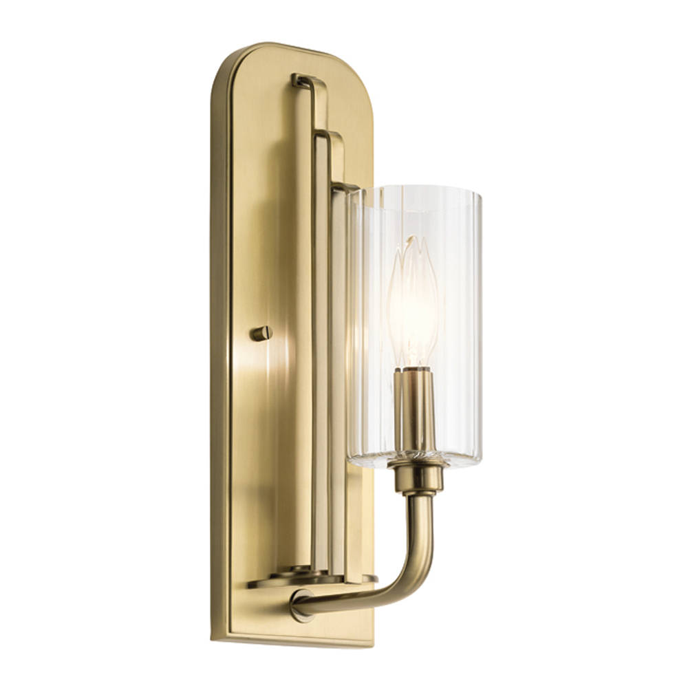 Бра Elstead Lighting QN-KIMROSE1-BNB. Шедевр в стиле ар-деко. Плафон изготовлен из прозрачного рифленого стекла с вертикальными желобками для мягкого эффекта игры света. Для обычного освещения без эффектов просто снимите плафон. Основание в отделке - Матовая латунь. Идеально подойдет для освещения гостинной, кабинета, кухни, прихожей, спальни, столовой.