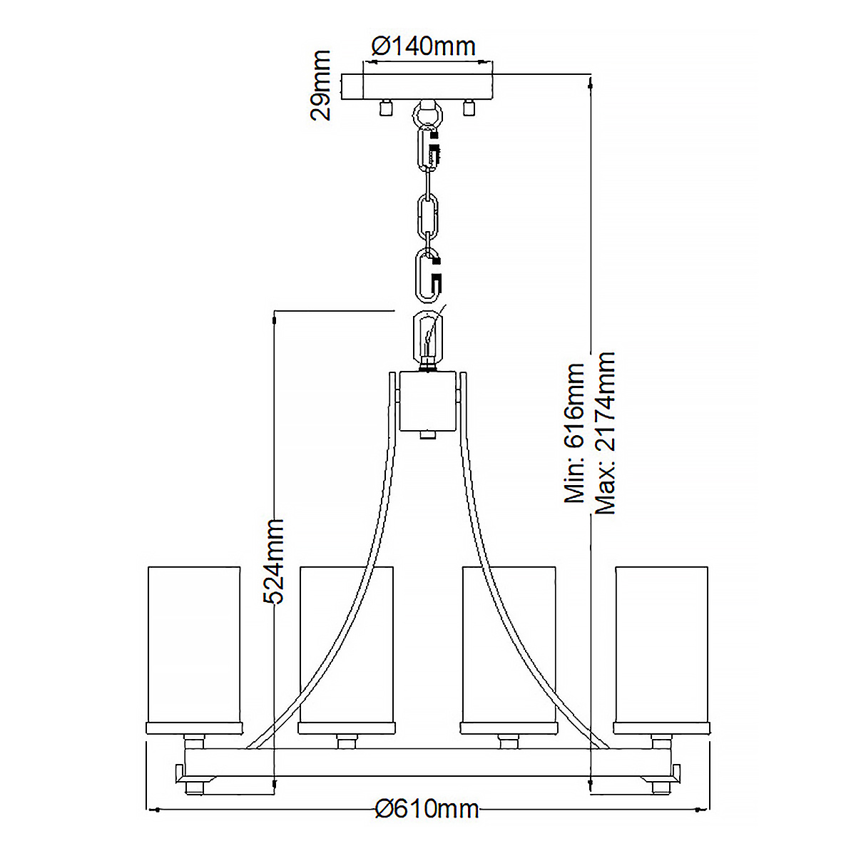 6 ламп - мин. длина - 61.6 см, макс. длина - 217.4 см. Ш61 х Г61 х В52.4 см (Вес 8.46 кг)